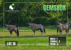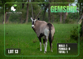 1.2 Gemsbok Offering Gemsbok from a proven herd known for consistency and exceptional quality. Strong genetics and attentive management are evident throughout, making this animal a standout addition to any ranch or herd. Pictures taken from the actual herd on the ranch. Individual animal may vary slightly due to catching, but quality is consistent across the herd. Located in Burleson Co. Spring 2026 Global Wildlife Solutions Exotic Wildlife Auction | 15 | $ 4,025.00 |
