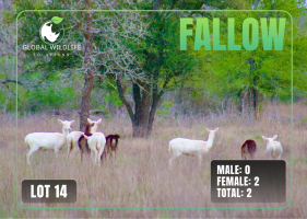 0.2 Fallow Deer Offering two female Fallow Deer, known for their elegant build and distinctive coat pattern. The ranch has a variety of coat colors. With balanced structure and confident presence, this animal will be a standout addition to any herd or ranch. Pictures taken from the actual herd on the ranch. Individual animal may vary slightly due to catching, but quality is consistent across the herd. Located in Burleson Co. Spring 2026 Global Wildlife Solutions Exotic Wildlife Auction | 14 | $ 325.00 |