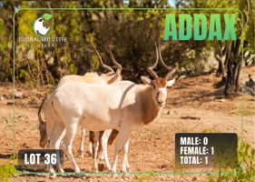 0.1 Addax 0.1 - Heavy Bred Female - Offering an Addax cow, a rare and distinctive species known for its light coat and elegant, twisted horns. Well-adapted and hardy, she brings both uniqueness and proven value to any herd or exotic program. She is Located in Concho Co. The picture is of the actual animal. Spring 2026 Global Wildlife Solutions Exotic Wildlife Auction | 36 | $ 3,300.00 |