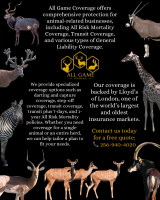 All Game Coverage All Game Coverage offers comprehensive protection for animal-related businesses, including All Risk Mortality Coverage, Transit Coverage, and various types of General Liability Coverage. We provide specialized coverage options such as darting and capture coverage, step-off coverage, transit coverage, transit plus 7-days, and 1-year All Risk Mortality policies. Whether you need coverage for a single animal or an entire herd, we can help tailor a plan to fit your needs. Call Today for a free quote @ (256)-940-4020. Spring 2026 Global Wildlife Solutions Exotic Wildlife Auction | 2 | $ 100.00 (Starting Bid) |