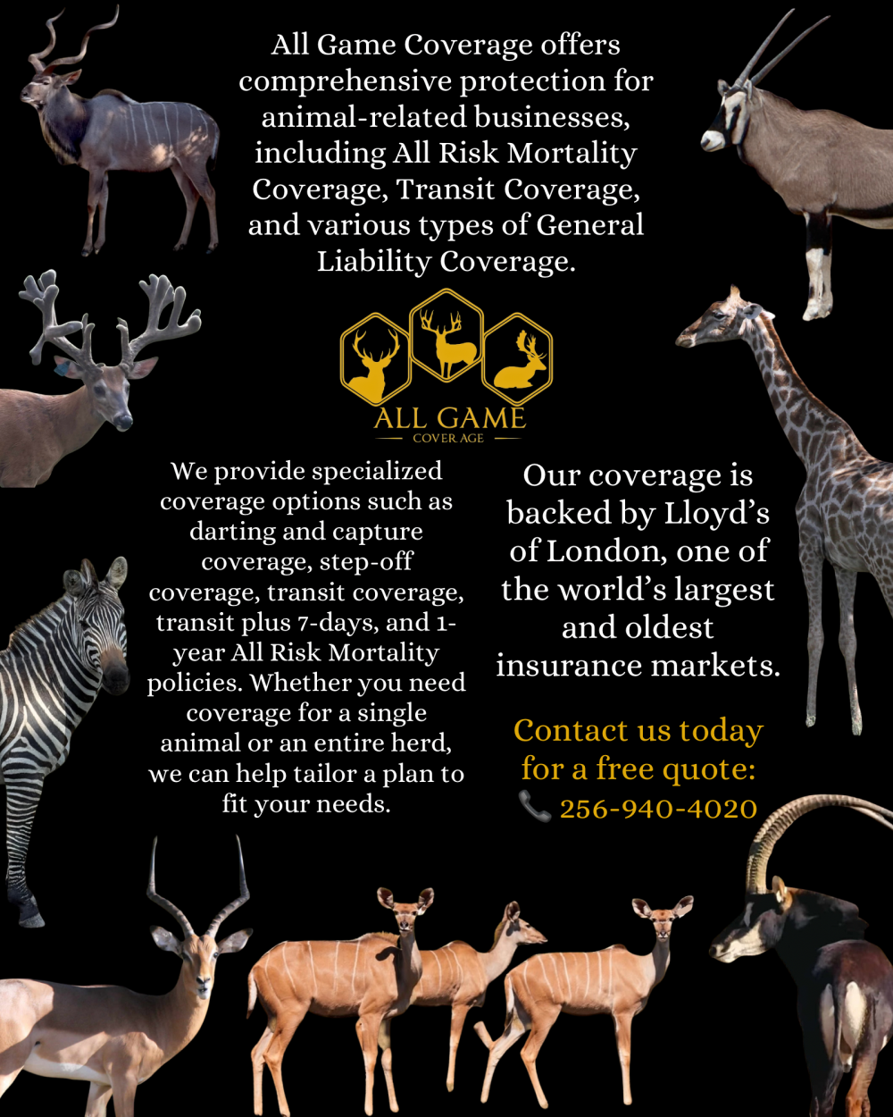 All Game Coverage offers comprehensive protection for animal-related businesses, including All Risk Mortality Coverage, Transit Coverage, and various types of General Liability Coverage.